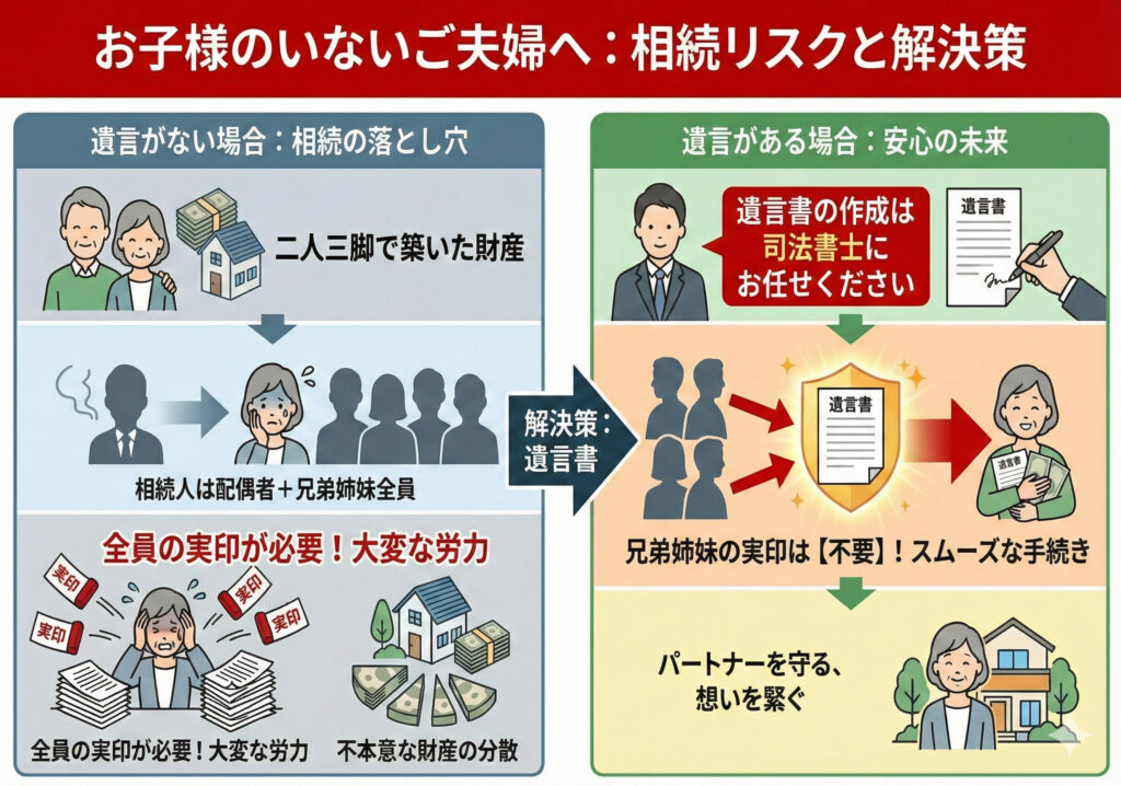 今まで二人三脚で築き上げた財産を兄弟姉妹に分けないといけなくなるのは、不本意ではないでしょうか。